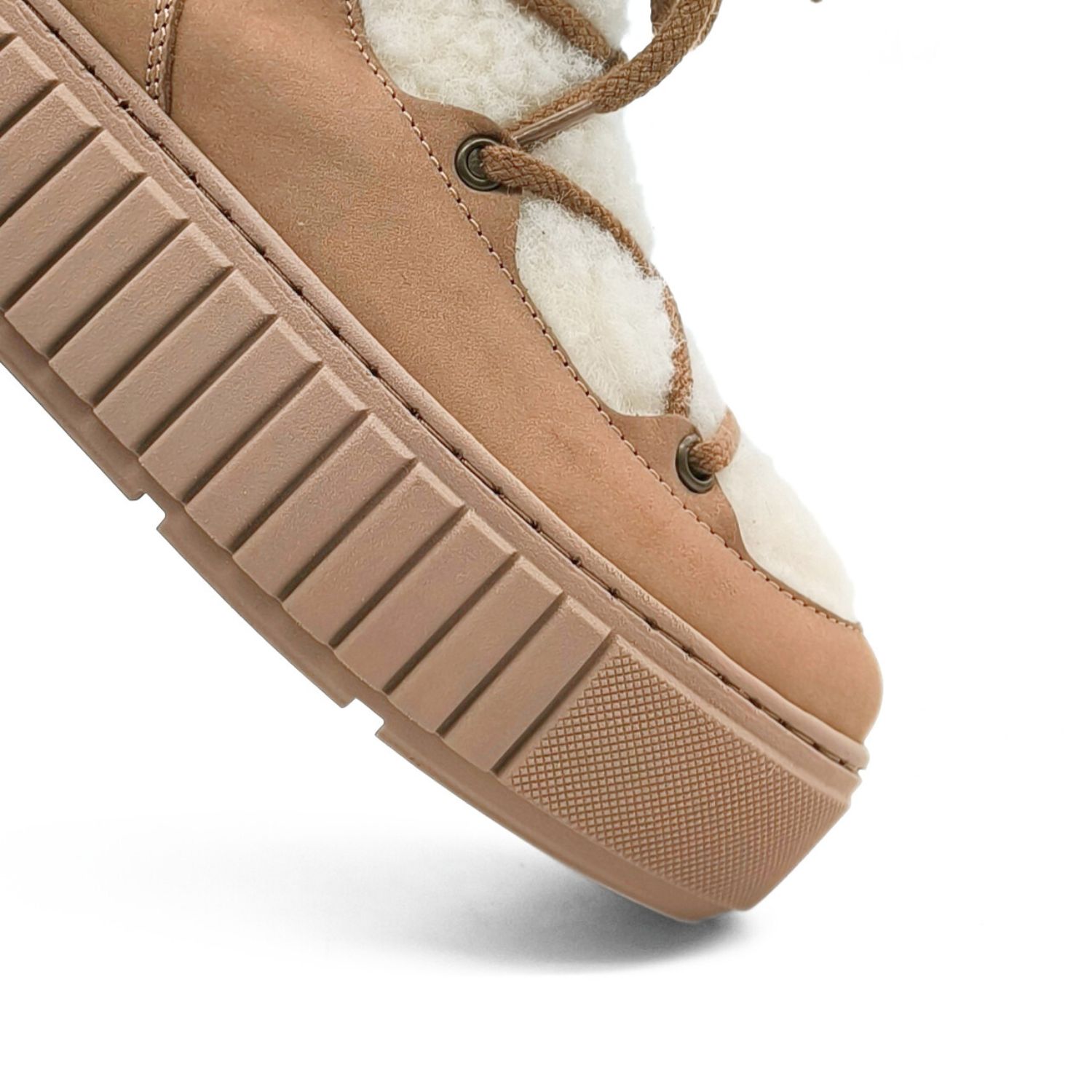 Der Bio-Boot mit Wolle – Capybara zeigt sich hier in softem Beige aus edlem Nubukleder – kombiniert mit weißer Schurwolle, die nicht nur innen wärmt, sondern auch außen unter der Schnürung sichtbar wird und dem Boot seinen besonderen Charakter verleiht.
