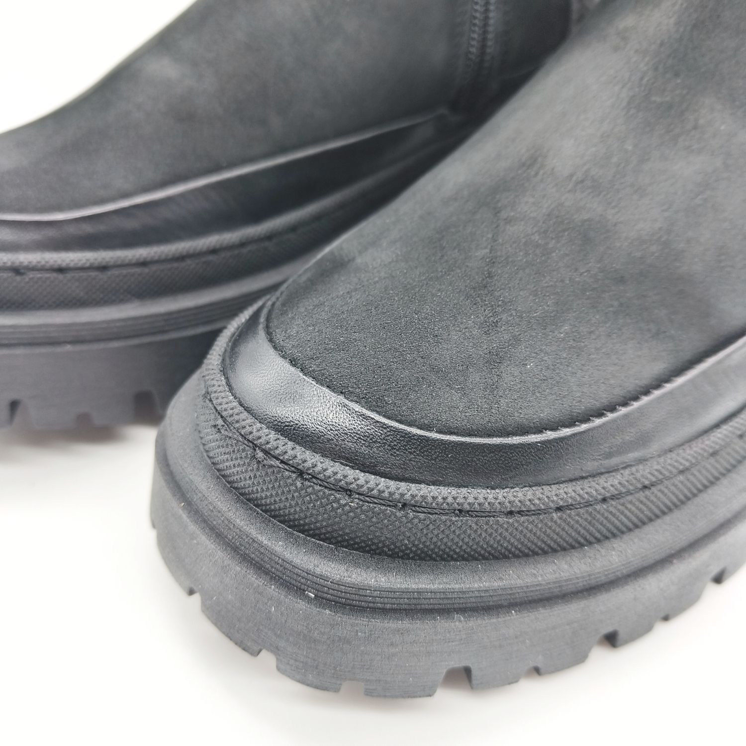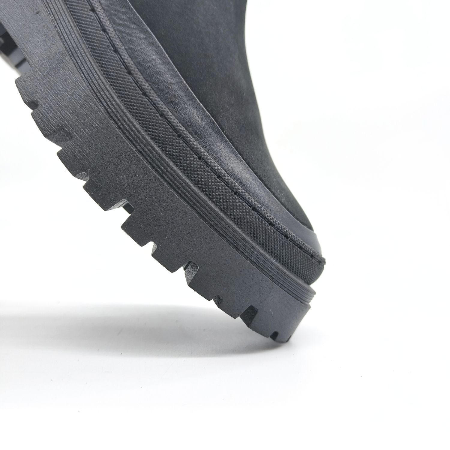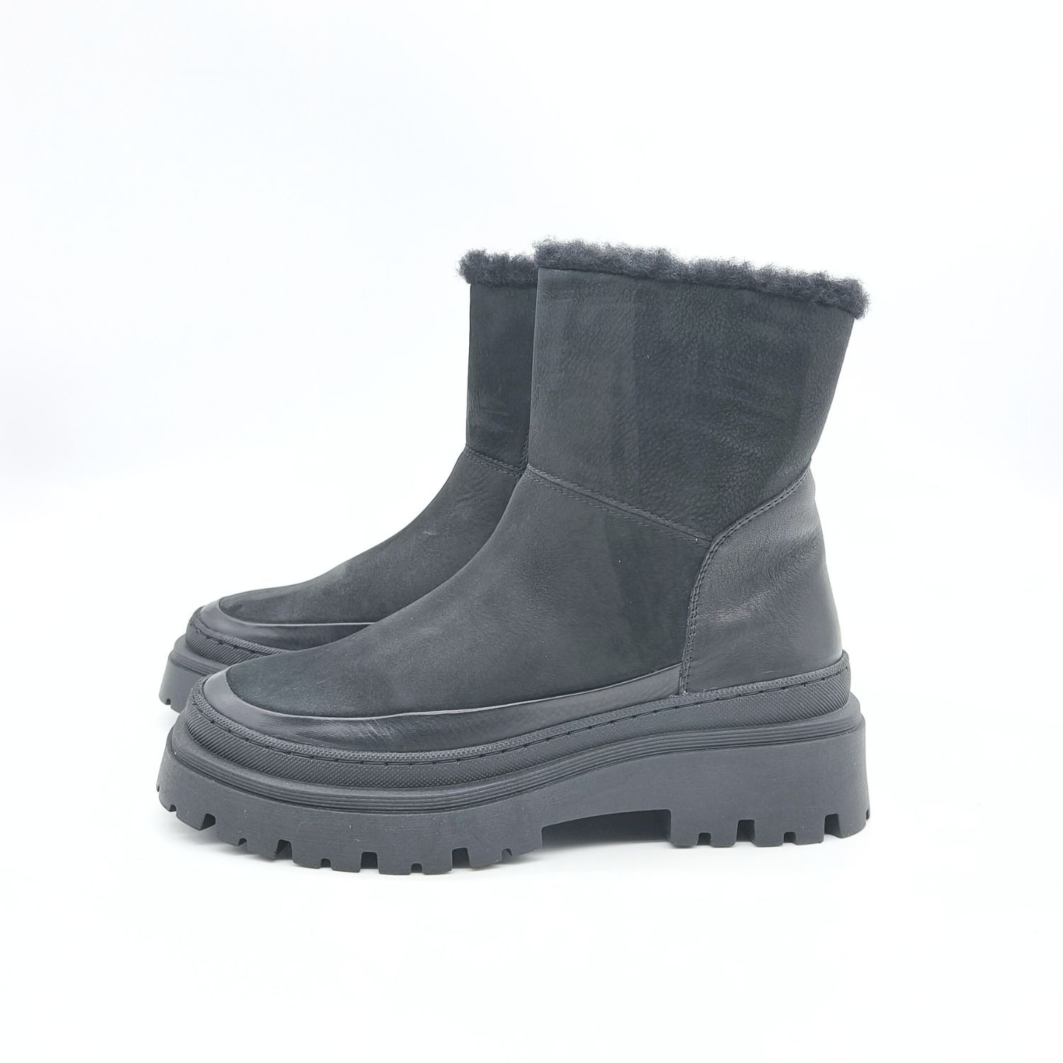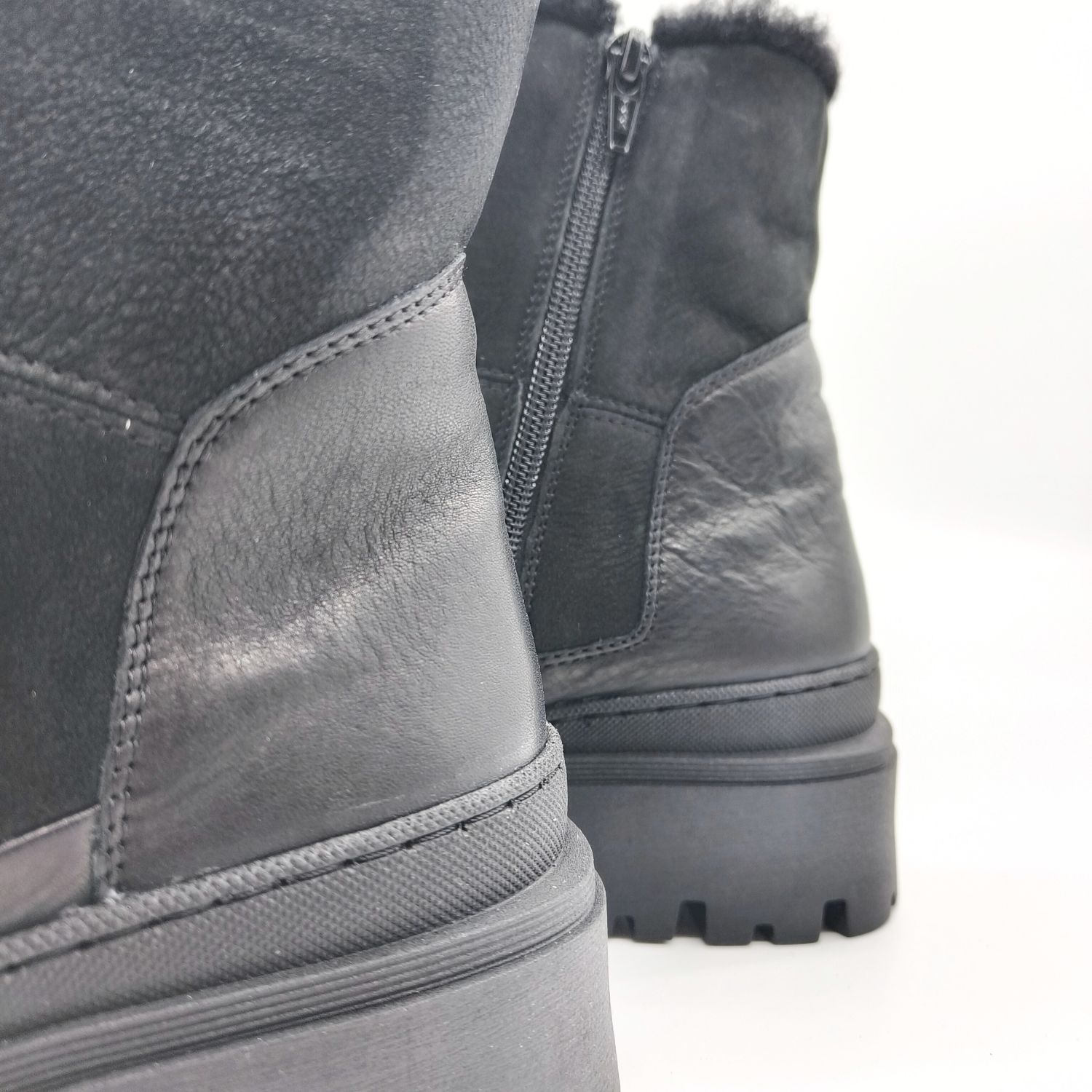 Der Königspinguin ist ein stilvoller Begleiter für die kalte Jahreszeit – warm, komfortabel und zugleich modern im Auftritt. Sein Obermaterial kombiniert feines, tiefschwarzes Bio-Nappaleder mit samtigem Nubukleder, was dem Boot eine edle Struktur und Tiefe verleiht.
