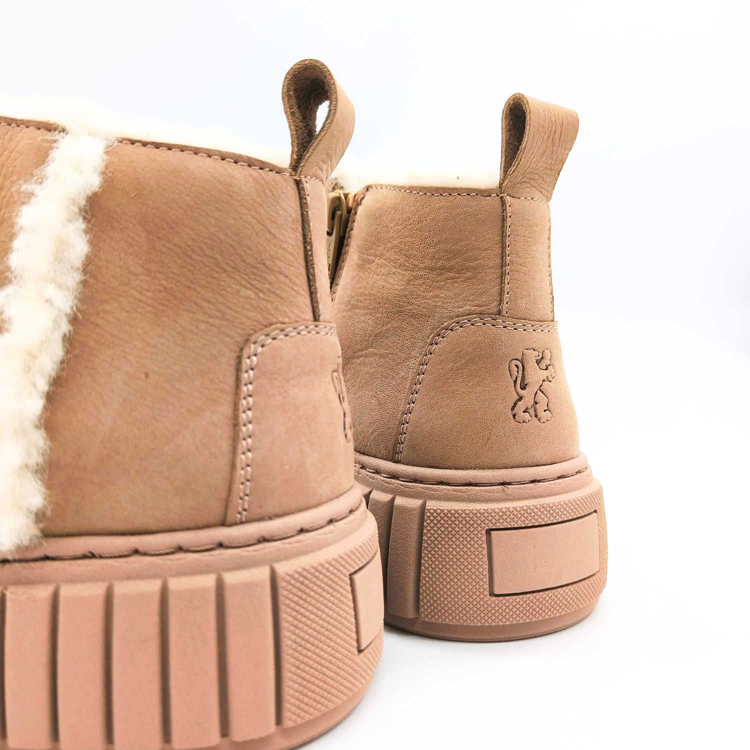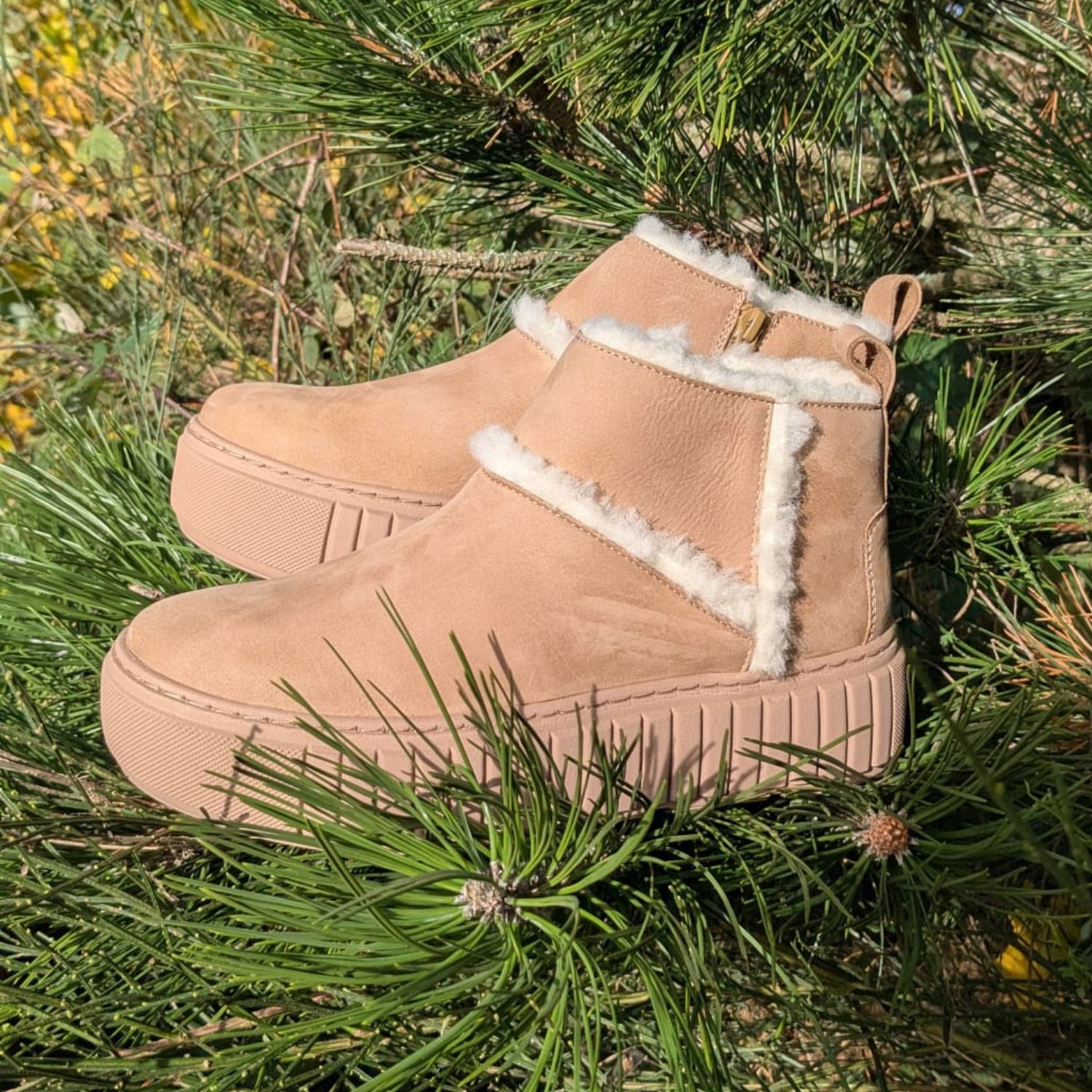 Der Bio-Low Boot Wildschaf in hellem Beige strahlt zeitlose Eleganz und natürliche Leichtigkeit aus. Gefertigt aus feinstem Bio-Nubukleder, verbindet es eine schlichte, klare Silhouette mit exklusiven Details: schmale, diagonal verlaufender Streifen aus weißer Schurwolle umspielen den Schaft und verleihen dem Schuh eine dezente, charaktervolle Note.