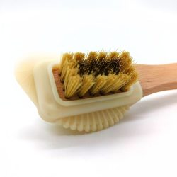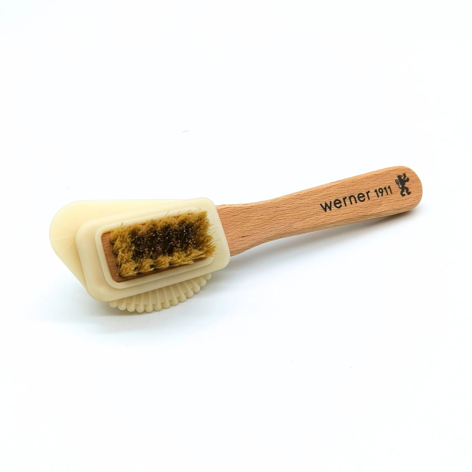 Zusätzlich verfügt die Bürste über praktische Kunststoffteile und geriffelten Kanten, die ideal sind, um hartnäckigen Schmutz aus dem Sohlenprofil zu entfernen. Die Noppenbürste auf der Rückseite dient dazu, die Lederfasern nach der Reinigung wieder aufzurichten und zu glätten, was den charakteristischen Nubuk-Look erhält.